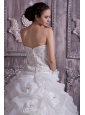The elegant wedding gown features a sweetheart neckline bodice accented with scattered appliques,which gives the dress a nicely and exquisite look. The skirt accents a ruffled mini out-layer makes the dress lookes big and cute. A short sweep train addes the grace and elegance.The lace-up back completes the look. You will have the chic and romantic wedding ceremory.