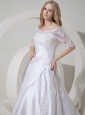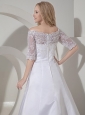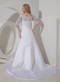 Custom Made A-line Scoop Low Cost Wedding Dress Satin Lace Chapel Train