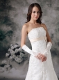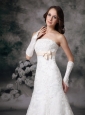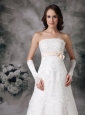 This perfect white wedding dress is accented with a straightline and a thin waistband embellished bowknot under the bust to flatter your curve. The A-line skirt has a court train and lace overlayed with the dress for accent. The hidden zipper secures the dress in place. The exquisite gloves complete the overall look. Heads will pathetically moon over her for months on end!