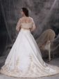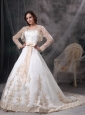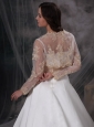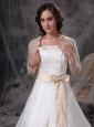 You will be the most beautiful bride in this wonderful wedding dress. The strapless dress features a long bowknot in the waist and embriodery in the skirt make this dress unique. The floor length skirt with a chapel train make the dress like a blooming flower. Little cute lace jacket add implicative beauty. You will be a shinning star in your wedding.