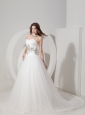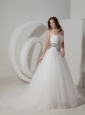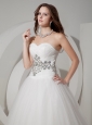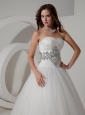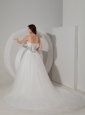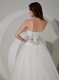 Strapless dresses are one of the sexier styles on the market today. This one features a strapless and sweetheart neckline bodice with wrapped details and beadings along the waist that look like a sash. Shimmering embellishments adorn the dress and catch the light in a lovely way. This white gown has a lovely a full skirt and a brush train.The dress sways beautifully across the floor when you move, as if you're floating on air.
