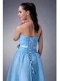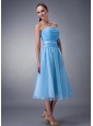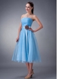 Custom Made Baby Blue A-line / Princess Bridesmaid Dress Strapless Hand Made Flower Tea-length Chiffon