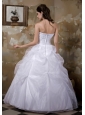 Puffy and joyful! This sweetheart wedding dress is highly featured with the pick-ups on the skirt which puff the dress out like a big bell. The ruched beads adorned with glittering beads which makes the dress look prettier than it should be.