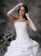 Modest and Noble! This beautiful wedding dress is characterized by the lace bodice and the ball gown falling from the fitted waist. The full skirt has bubble pick-ups overlayed the sheer lace underskirt, which adds to its fullness. The back features a corset-style closure that ensures a perfect fit. The matching gloves complete the overall effect. You will won the standing ovation in this fantastic wedding dress!