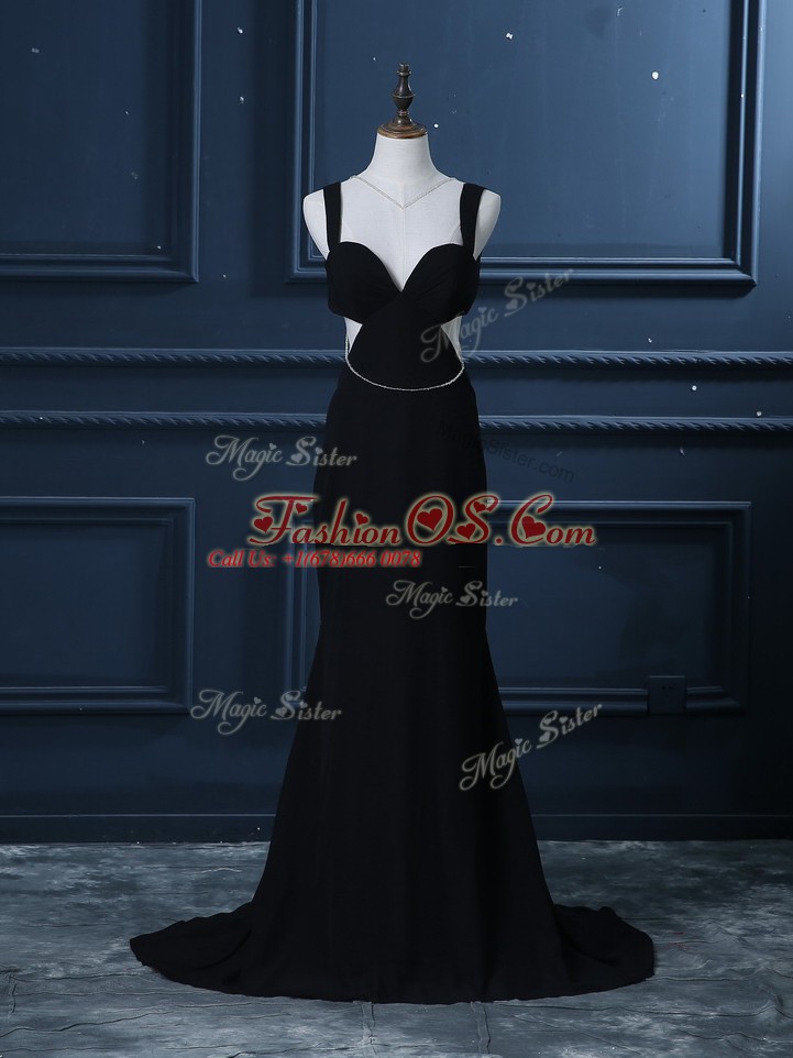 Custom Made Black Chiffon Backless Celebrity Evening Dresses Sleeveless Brush Train Beading