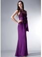 Home >  Bridesmaid Dresses >  Elegant Bridesmaid Dresses > Custom Made Eggplant Purple Cloumn Halter Bridesmaid Dress Bow Brush Train Elastic Woven Satin and Chiffon