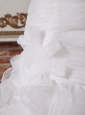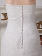 There are so many beautiful design elements in this dress that we really don't know where to start in describing it! The dress is in mermaid style and features a sweetheart neckline which is lovely and sexy. The whole pleated bodice hugs your curves past your hips where the ruffles begin. The skirt is made from several gorgeous tiers of wrapped ruffles that blend beautifully all the way to the floor. The skirt extends into a brush train, which moves fluidly when you walk. Zipper up closure with a row of cute buttons complete this dress.