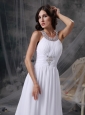 This luxurious white wedding dress features a shinning beaded scoop neckline and the ruched bust creating the a curvier appearance. The wide ruched waistband embellished with the shimmering decoration in the mid-section that will enhance your femininity nicely. The soft chiffon skirt has a court train that gives you a spectacular rippling wave appearance. The crossover straps and zipper in the sexy back finish all the look.