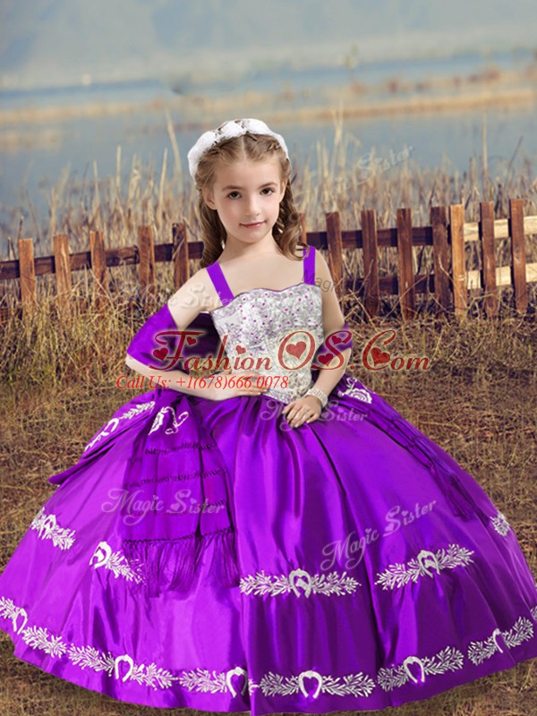 Custom Made Floor Length Purple Pageant Dress for Teens Satin Sleeveless Beading and Embroidery