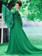 If you are interested in chinese movies, you will find with this dress you will like a fairy maiden. The fitted bodice is adorned with a scoop neckline and exquisite beadwork and also embellished with long lace sleeves which adds romantic look. Floor-length design with a brush train makes this skirt more flowy and beautiful. A zipper up back completes this fabulous dress. What are you looking for? Bring it to your home with no hesitation!