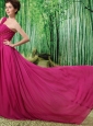 Bright and dramatic! This prom gown must let you stunning on the crowd. It features a one-shoulder bodice with ruching detail. A asymmetrical waist sash adds rhinestones beading and details to the dress. The floor-length skirt is a long begins at the waist and envelopes the legs in soft chiffon all the way to the floor in clean lines. The court train and zipper up back finishes the look. If you are looking for a charming dress without the high-end price tag, this is undoubtly tone you should consider.