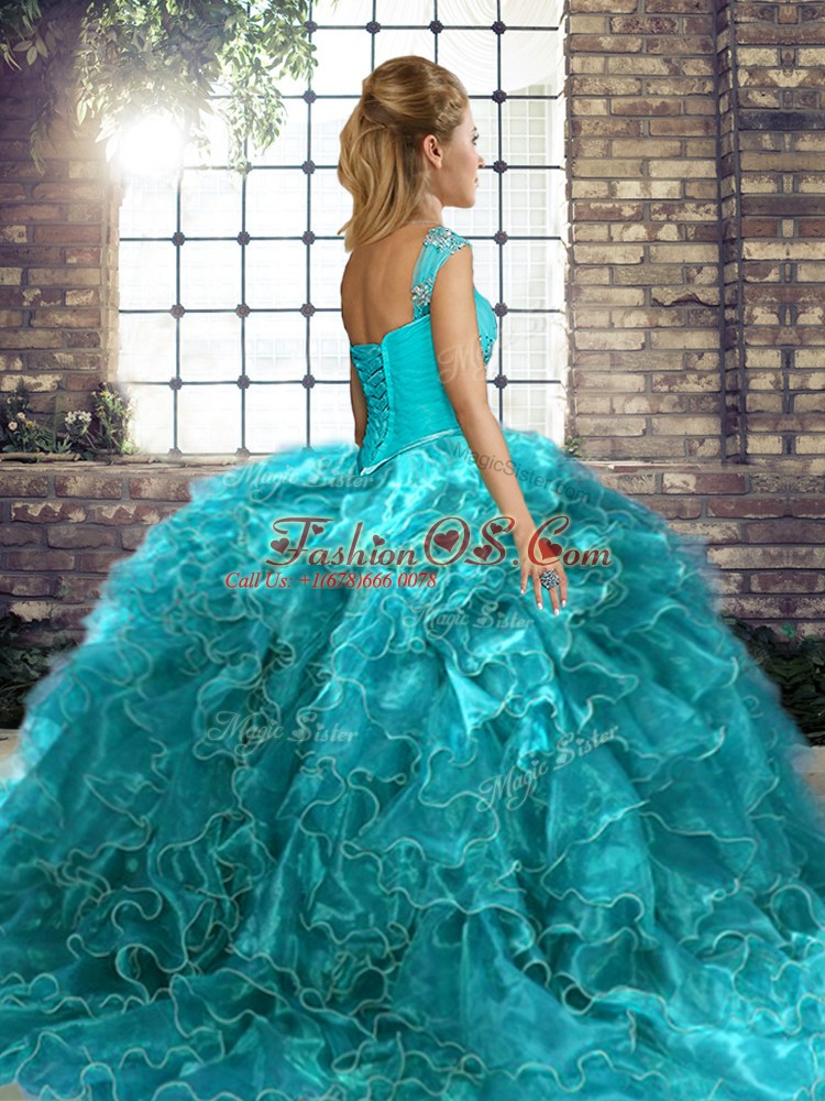 Custom Made Green Lace Up Quince Ball Gowns Beading and Ruffles Sleeveless Brush Train