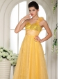Dramatic and sophisticated are two words to perfectly describe this yellow prom dress at the first sight. It features a gorgeous one shoulder bodice, which generally considered more provocative than other style, which is heavily embellished with intricate beadwork. A wide contrasting waistband hug your figure. While the wide strap are also heavily decorated with hand made flower. The floor length skirt is so smooth and elegant in sequined fabric. A hidden zipper up completes this fabulous design!