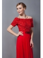 What an elegant red satin chiffon dress! The dress is chi and sophisticated designed for the women who wants to be noticed. It features off the shoulder style with a bodice entirely covered by lace details with beadings accent. A bow-like beadwork catched the light beautifully at the waist from where the skirt flows naturally to the floor in soft pleats and folds with a mini train behind. It will make you stunning in the party.