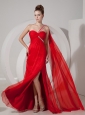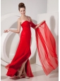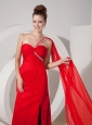 Red chiffon sweetheart prom dress features the fabulous status. Low cut back and side splitting accent your sexy feeling. One-shoulder design is great and attractive. A hidden zipper in the back secures the dress in place and ensures a great fit. This excellent dress is your best choice for any party.