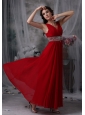 Make an entrance in this elegant and romantic v-neck evening dress. The skirt is flowy with soft chiffon to your ankle. This red prom dress features a lovely v-neck bodice with intricate beadwork throughout the waist. The zipper up back completes the look and hold the dress in places.
