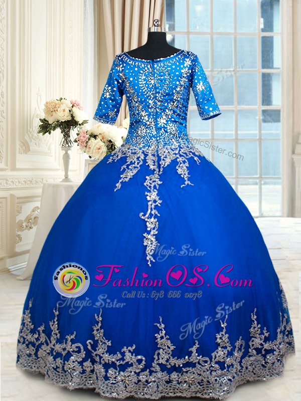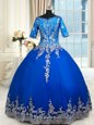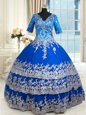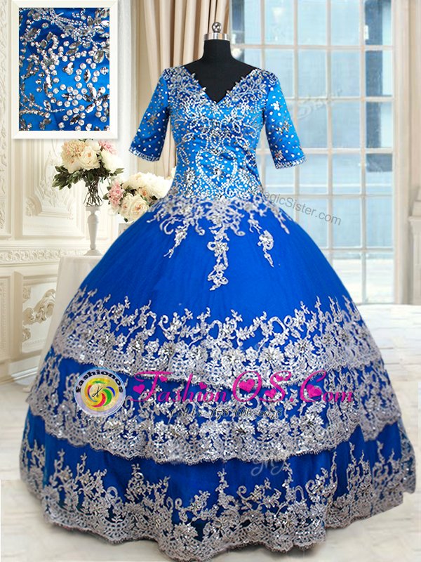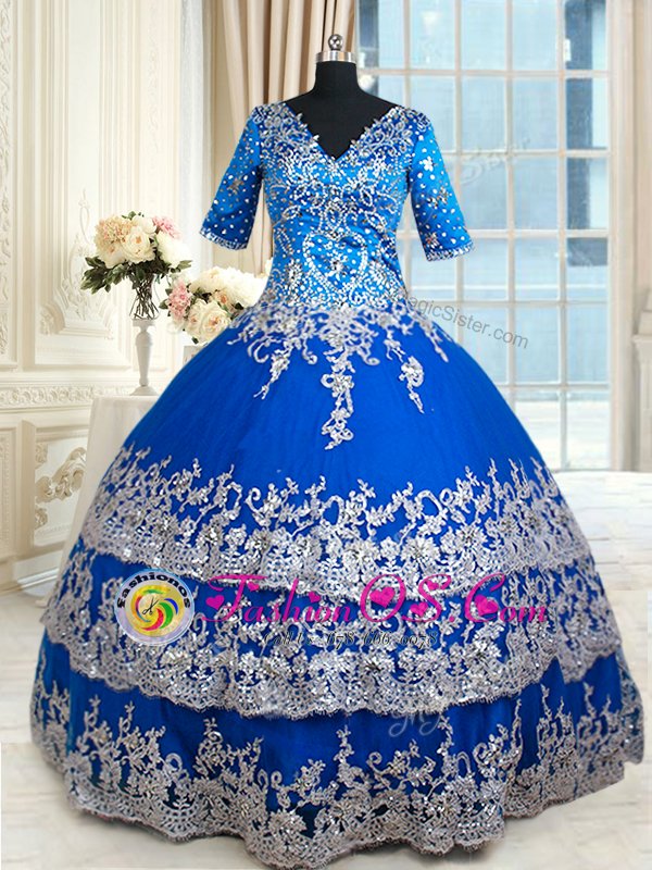 Custom Made Royal Blue Quince Ball Gowns Military Ball and Sweet 16 and Quinceanera and For with Beading and Lace and Ruffled Layers V-neck Half Sleeves Zipper