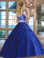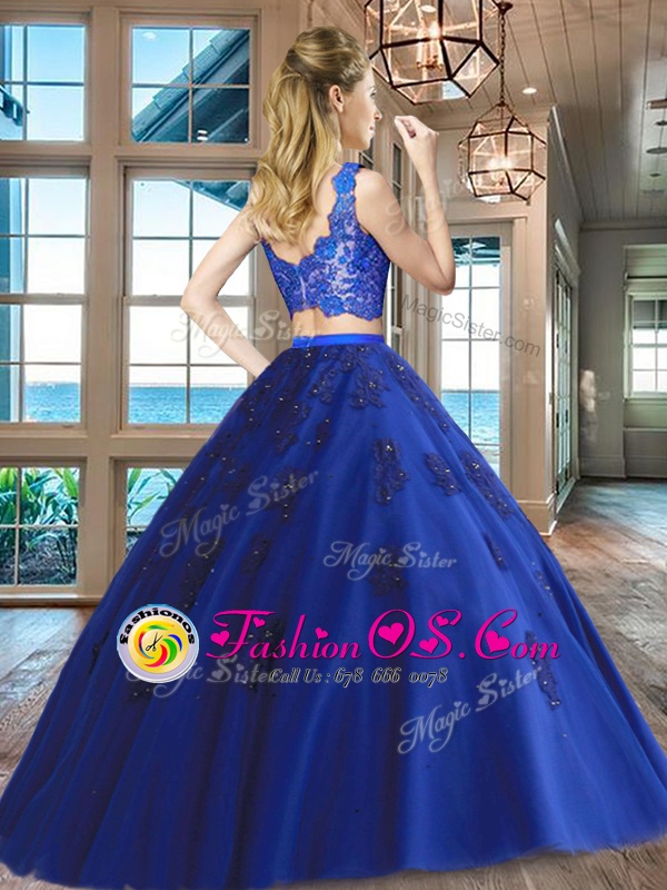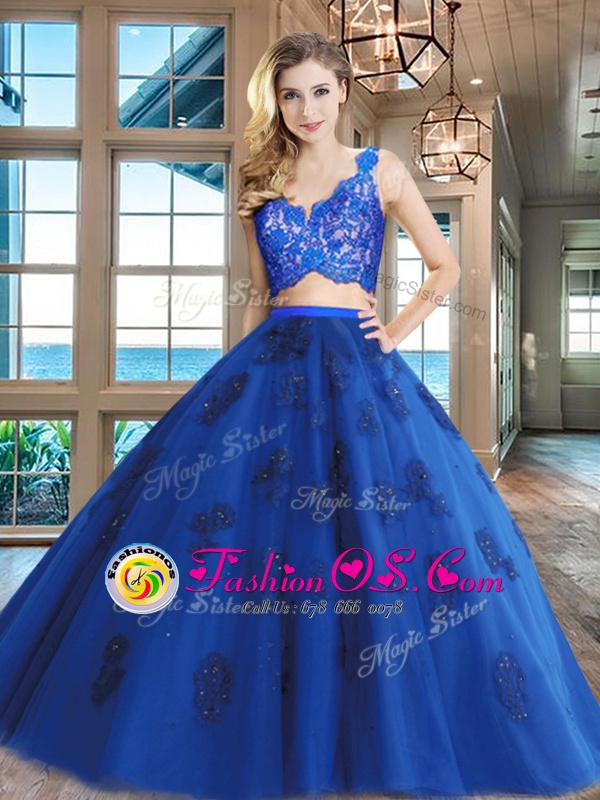 Custom Made Royal Blue Two Pieces V-neck Sleeveless Tulle Floor Length Zipper Lace and Appliques Sweet 16 Dress