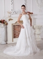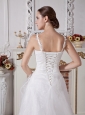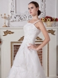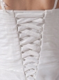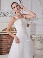 Make an entrance in this elegant and romantic spaghetti straps wedding gown. It features a stunning bodice with asymmetrically ruches and lovely exquisite appliques. The layered A-line skirt flows beautifully with a loose fit. A lace up corset style closure in the back secures the dress in place. The brush train completes the look.