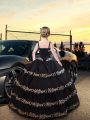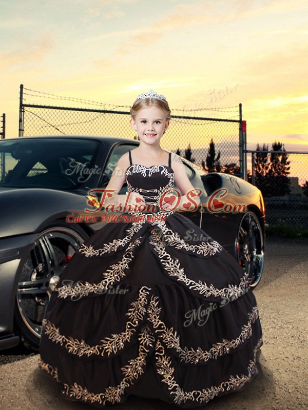 Custom Made Spaghetti Straps Sleeveless Pageant Dress for Girls Floor Length Embroidery and Ruffled Layers Black Taffeta