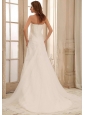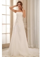 Simply gorgeous this white wedding dress is! The fitted, strapless bodice features a straight neckline and ruched applique decorations throughout. The skirt in stunning fabric hugs hips to the floor to create a beautiful sweep train. Stunning beadings accent one side of your bodice. A zipper up back completes this fabulous design. The simple one can leave a longer impression in contrast, and this one is a perfect example!