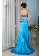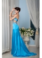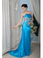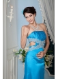 Custom Made Teal Column / Sheath Strapless Prom Dress Satin Beading Brush Train