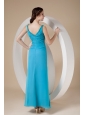 If you are looking for one style to show off your slim curves, this teal prom dress is a your perfect choice. It features a V-neck, same V style in the back that show the beauty of your back. The stunning bodice is encrusted with exquisite ruchings and embellished beadings, while the ankle length skirt flows freely to create a graceful sheath in the side. A zipper in the back completes this gorgeous design.