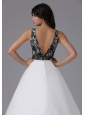 This dramatic gown is sure to turn heads! This dress has two wide straps forming a deep V-neckline and the whole lace bodice adds another dimension of the beauty. The A-line skirt covered with light-weighted white tulle splits to show the inner skir that creats more fun. A hidden zipper makes for easy off and on and secures the dress in place.