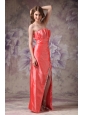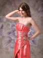 This watermelon red prom dress can give you a visual impact at the first sight. Sexy strapless design does not lack of stability and sex yet elegance, while the stunning bodice is adorned with embellished beadwork and exquisite ruchings. The shimmering skirt flows freely to the floor with a beadings decorated slit in the middle section. An adjustable lace up in the back completes this fabulous design.