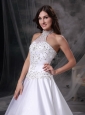 Custom Made White A-line Wedding Dress Halter Satin Embroidery and Beading Cathedral Train