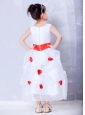 Custom Made White and Red A-line Scoop Hand Made Flowers Flower Girl Dress Ankle-length Organza and Taffeta