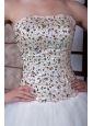 The bodice accented by the sequins and the boning details flatters most figures.It truly is an example of high end couture fashion.The skirt is asymmetrical and winding series of ruffles that begins at the hips and envelopes the legs in luxurious tulle all the way to the floor. You are sure to be charming and fabulous at your very special day.A simple zipper up back completes the look.