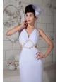 Home >  Prom Dresses >  Sexy Prom Dresses > Custom Made White Empire V-neck Prom Dress Chiffon Ruch Brush Train