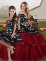 Custom Made Wine Red Lace Up Quinceanera Gown Embroidery and Ruffled Layers Sleeveless Brush Train