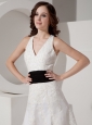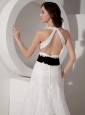 Customize A-line Halter Court Train Satin and Lace Appliques Wedding Dress