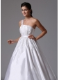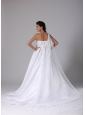 If you are looking for a wedding gown that is simple, yet elegant, this one would be a great choice. This dress features the bodice with exquisite embroidery and satin. The see through one shoulder adds the charm. The watteau train completes the look. The back features a zipper up closure that ensures a perfect fit. All eyes are on you!