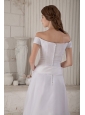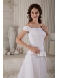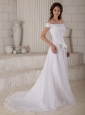 Are you searching for a simple but elegant dress? This one is sure for your to own. This all white wedding dress with no luxurious beading on is really a simple one. But when you see it, you will sure say"It is so beautiful". The comely dress features an off shoulder design with a square neckline. A close-fitting bodice which has a wide sash on the waist band that can fold a bow at one side as you like. The skirt is loose with a champel trail. The special back style has many buttons on it.