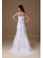 This angelic wedding dress features a strapless neckline with appliques accented with the outlayer tulle which makes the dress more charming. The back of the bodice has elegent zipper up closure with bow decorated and the back of this stunning A-line gown extends to a brush train. Wearing this dress and you will be the shining star in your wedding.
