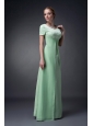 Add a romantic edge to any special occasion in this elegant light green gown. A light green prom dress featuring a V-neckline bodice with short sleeves and sparkling accents on the bust and circles around to the sleeves.