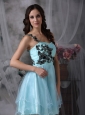 An aqua blue short prom dress, sweet sixteen party dress, or semi formal dress for any occasion you want to make special. The ruched sweetheart bodice has thin spaghetti strap, which is covered by exquisite floral applique.The super cute mini skirt is covered with sheer layers that give it a full sassy style that will look great on the dance floor. The zipper in the back secures the dress in place and ensures a great fit.