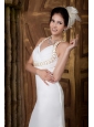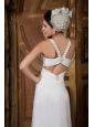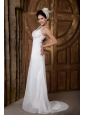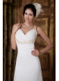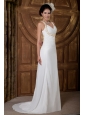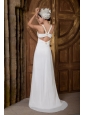 If you are looking for a perfect gown for your grand wedding, this must be the one you shoulder take a look. It has a deep V-neck design on the pleated bodice. Specially designed straps continues around the bust in the front and gathered with a wide line in the back which adds interests and detail. Soft chiffon skirt falls naturally and continues in the back to be a chapel train.