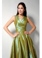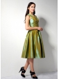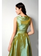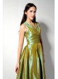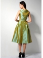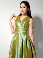 Customize Olive Green A-line V-neck Bridesmaid Dress Tea-length Ruch Taffeta