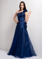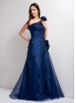Silhouette: A-line Neckline: One Shoulder Waist: Fitted Hemline/Train: Floor-length Sleeve Length: Sleeveless Embellishment: Hand Made Flowers Back Detail: Zipper-up Fully Lined: Yes Built-In Bra: Yes Fabric: Tafeta and Organza Shown Color: Peacock Blue(Color & Style representation may vary by monitor.) Occasion: Wedding Party, Formal Evening Season: Spring, Summer, Fall, Winter