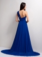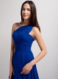 Customize Peacock Blue A-line One Shoulder Ruch Bridesmaid Dress Court Train Elastic Wove Satin and Chiffon