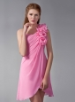 Customize Rose Pink Empire One Shoulder Hand Made Flowers Bridesmaid Dress Mini-length Chiffon
