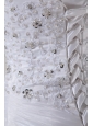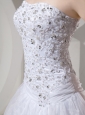 Gorgeous wedding gown dress! This strapless A-line style dress features a fitted bodice embellished with exquisite appliques and beadings which Photograph echo with those decorated on the very bottom. Puffy pick-ups draped in the midle part will surely strick your eyes! The lace-style closure with a chapel train in the back adds the dress a sense of elegance and modesty.