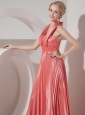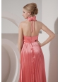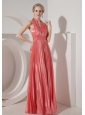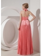 Customize Watermelon Red Evening Dress Column Halter Elastic Woven Satin Beading Floor-length