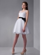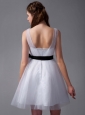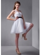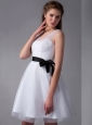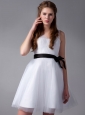 Customize White A-line V-neck Bow Bridesmaid Dress Mini-length Tulle and Taffeta