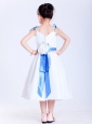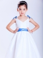 Customize White and Blue A-line V-neck Bows Flower Girl Dress Tea-length Taffeta
