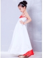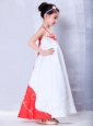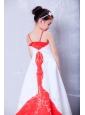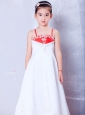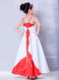 Customize White and Red A-line Straps Embroidery Flower Girl Dress Ankle-length Satin